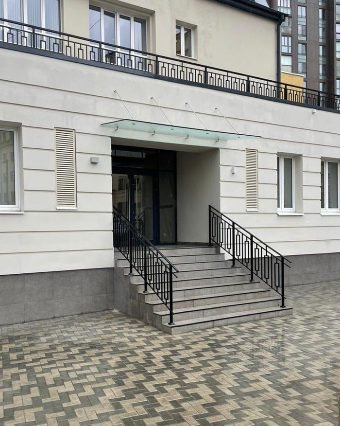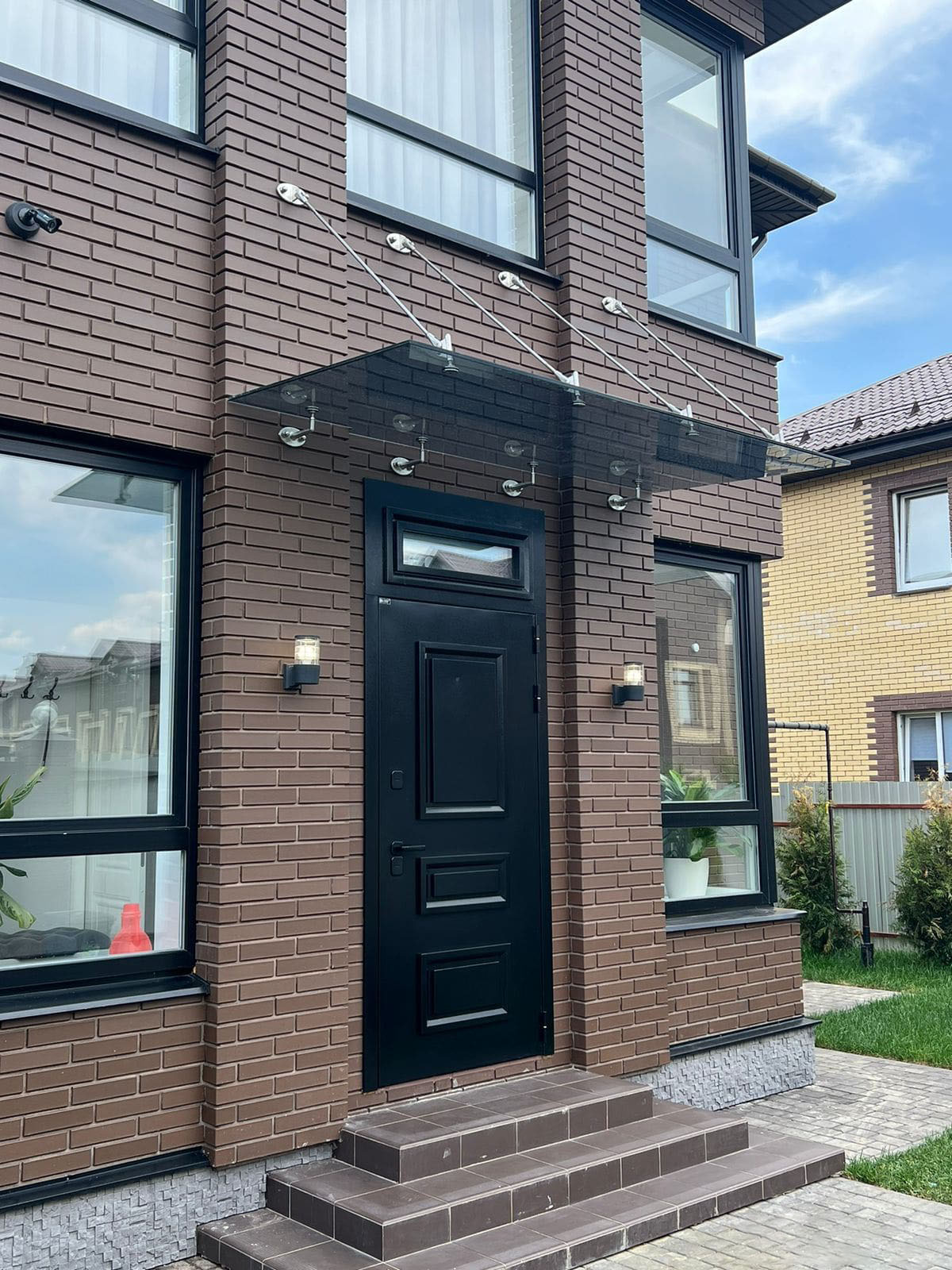 Стеклянный подвесной козырек выглядит изящно и утонченно. Со стороны он может показаться хрупким и ненадежным, однако это впечатление обманчиво, поскольку при его изготовлении используется специальный материал – триплекс из закаленного стекла, отличительной особенностью которого является высочайшая прочность. Ему не страшны удары, которым он может быть подвержен, например, во время сильного града или в результате падения с крыши сосулек, а также агрессивное воздействие снегопадов, дождей, сильного ветра или солнечного света. Важно отметить, что, несмотря ни на какие атмосферные явления, стеклянные козырьки сохраняют не только свои функциональные качества, но и эстетичный внешний вид.
